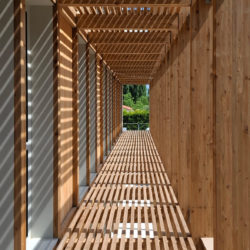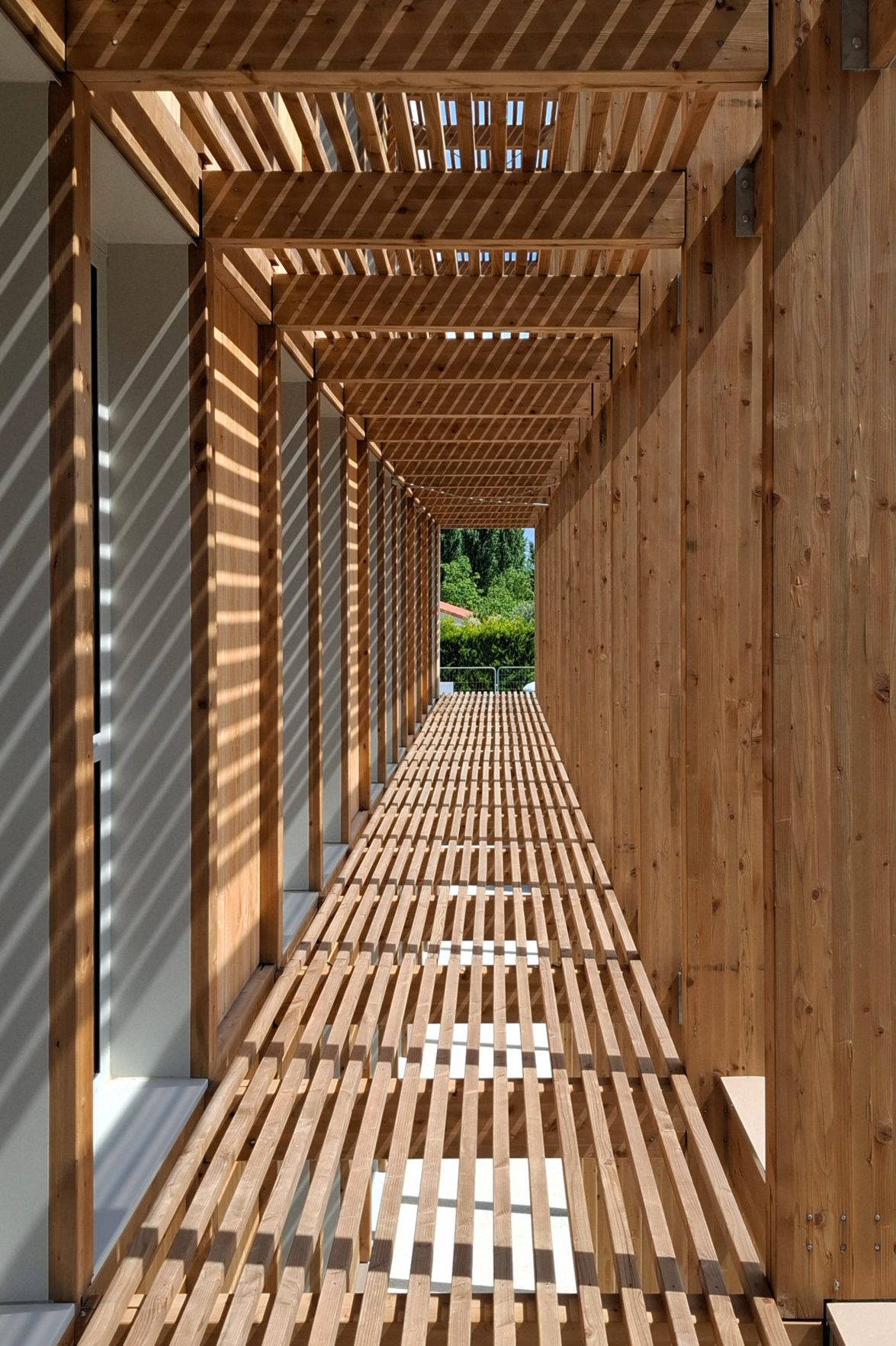 La façade Sud raconte d’emblée la trame de composition du bâtiment. Le grand portique qui protège les salles de consultation du soleil d’été évoque, en une dentelle délicate, les pans de bois des dernières maisons médiévales du cœur de Bastide. Ce maillage structure le bâtiment.